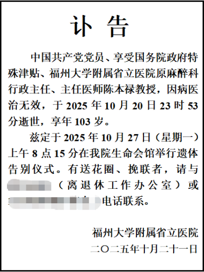 2025年10月20日23时53分,中国共产党党员、享受国务院政府特殊津贴专家、福州大学附属省立医院原麻醉科行政主任、主任医师陈本禄教授,因病医治无效,与世长辞,享年103岁。