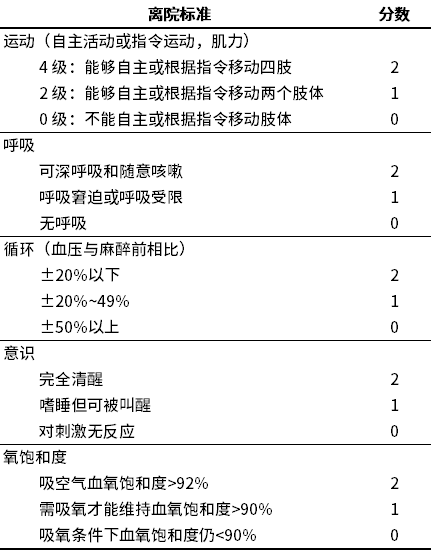 注:改良 Aldrete 评分总分为 10 分,9 分或 9 分以上可以离开麻醉后恢复室(PACU)