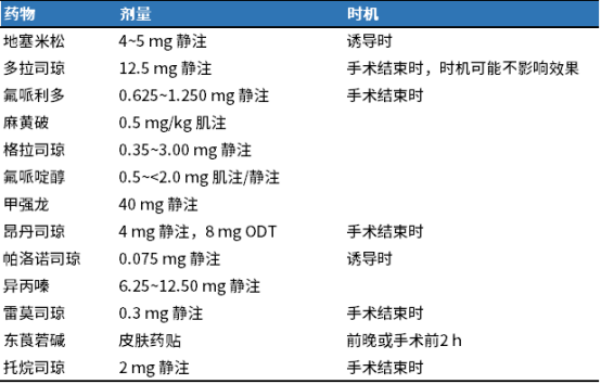 减少PONV的策略:采用区域麻醉;优先使用丙泊酚或环泊酚诱导及维持麻醉;避免使用挥发性麻醉药;手术当天给患者补充足够液体;多模式镇痛,尽量减少围手术期阿片类药物。