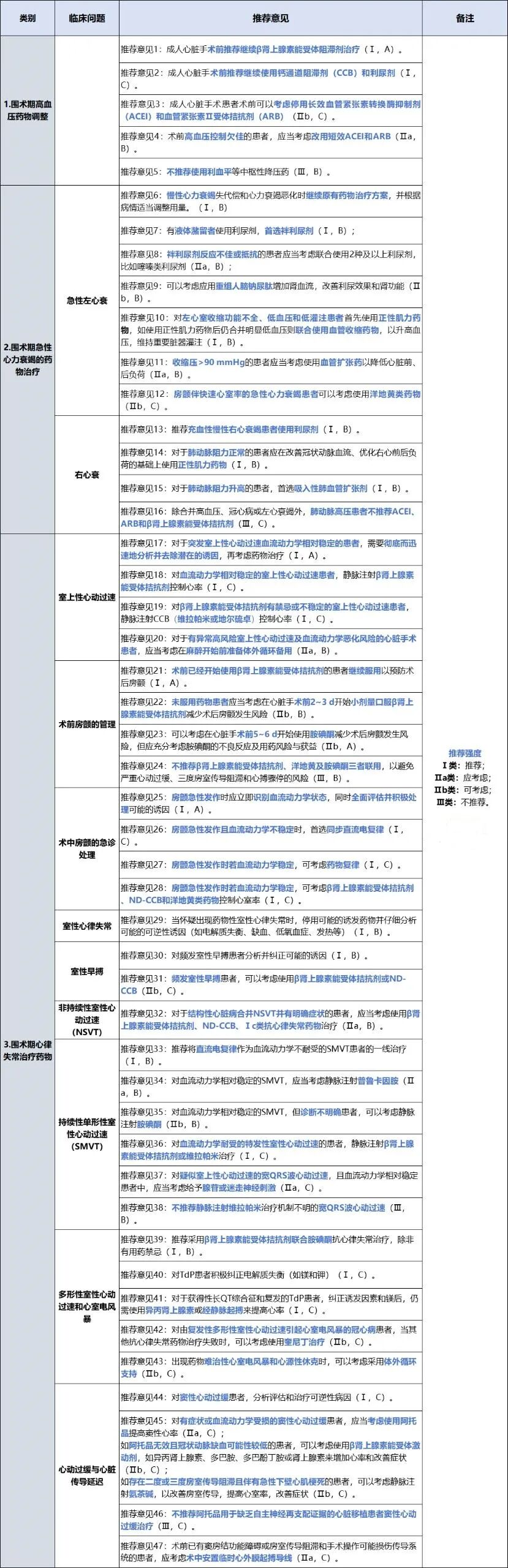 为便于临床快速掌握,本文基于最新共识文件,提炼出涵盖高血压、心力衰竭、心律失常、凝血功能调控、血糖管理、器官保护六大板块的75条核心推荐意见,助力麻醉、外科、药学及护理团队实现标准化、多学科协作用药管理。(文末附推荐意见汇总表)