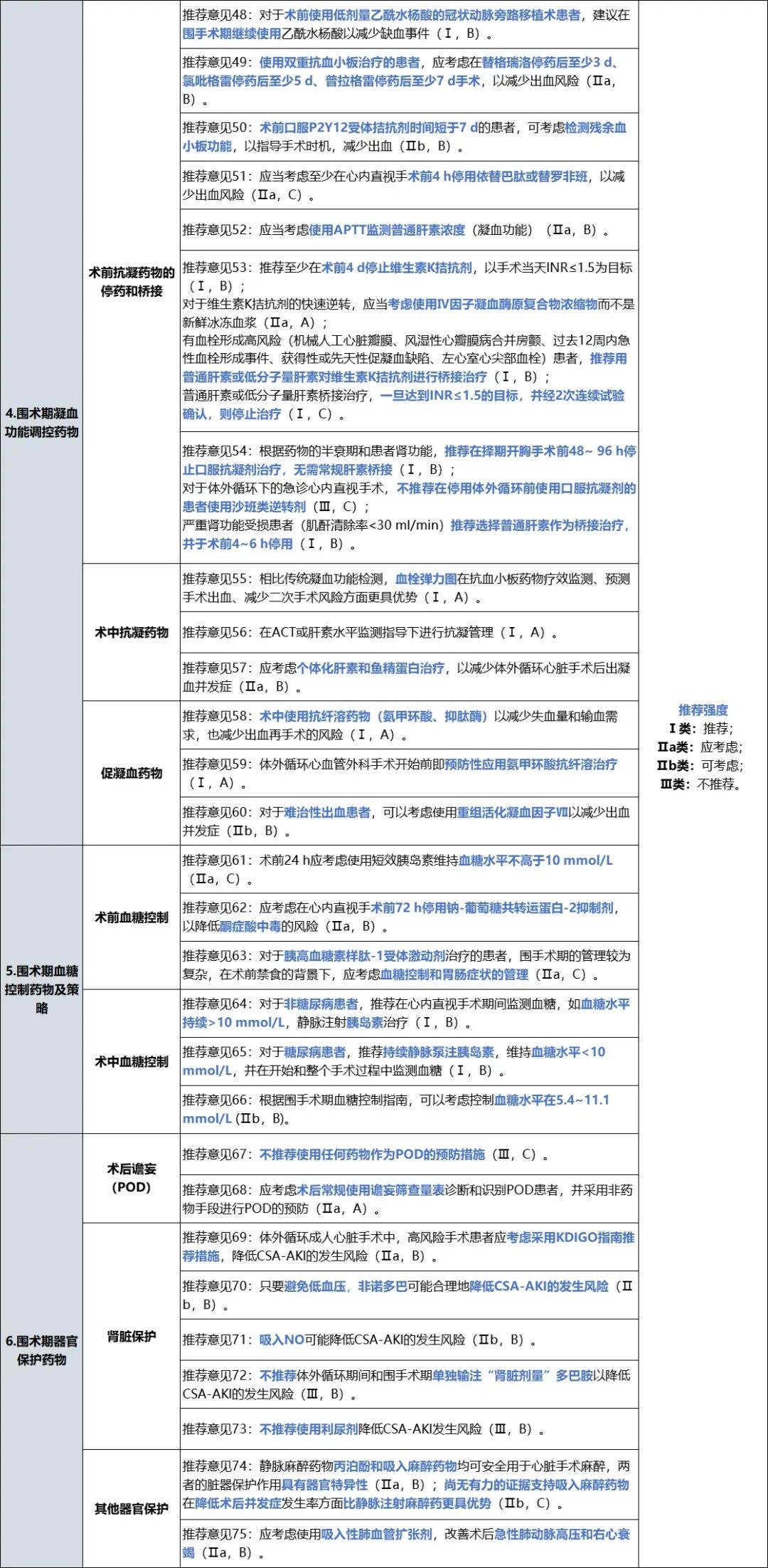 推荐意见1~3:成人心脏手术前推荐继续β肾上腺素能受体阻滞剂治疗(Ⅰ,A);术前推荐继续使用钙通道阻滞剂(CCB)和利尿剂(Ⅰ,C);术前可以考虑停用长效血管紧张素转换酶抑制剂(ACEI)和血管紧张素Ⅱ受体拮抗剂(ARB)(Ⅱb,C)。