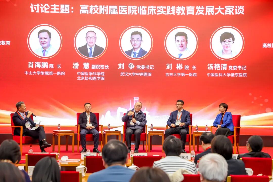 主论坛特设圆桌讨论环节,圆桌讨论由中山大学附属第一医院院长肖海鹏主持。中国医学科学院北京协和医学院副院校长潘慧、武汉大学中南医院党委书记刘争、吉林大学第一医院院长刘彬、中国医科大学盛京医院党委书记汤艳清共同参与。圆桌讨论以“高校附属医院临床实践教育发展”为主题,五位专家围绕“在高校附属医院建设中,一把手应当做什么,怎么做?”“高校与附属医院之间,应当如何进行协同”“AI时代来临,我们应该做什么”等核心问题展开深入交流。