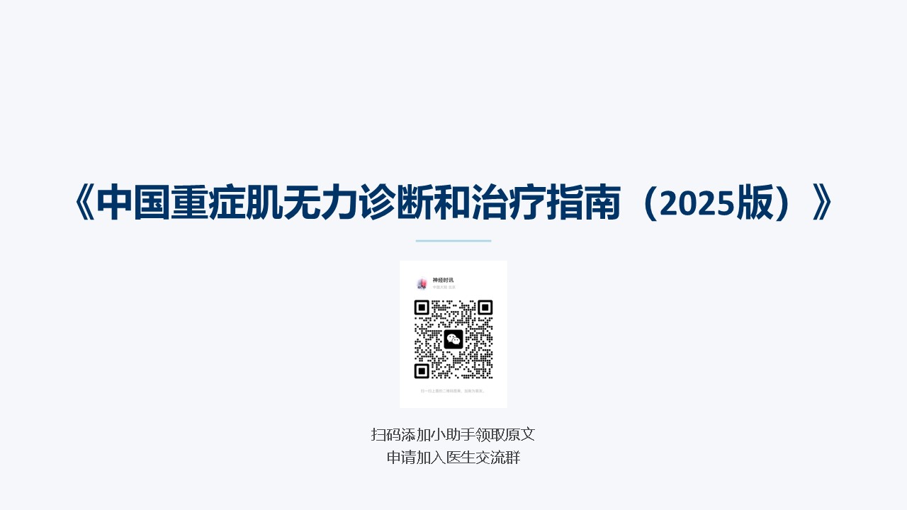 中国重症肌无力诊断和治疗指南(2025版)PPT 来源: 神经时讯 2026-01-30 14:36:22 扫码关注公众号,回复【重症肌无力】领取PPT和指南源文件 COMMENTARY 评论 共0条 发布 RECOMMENDATIONS 推荐内容 暂无数据