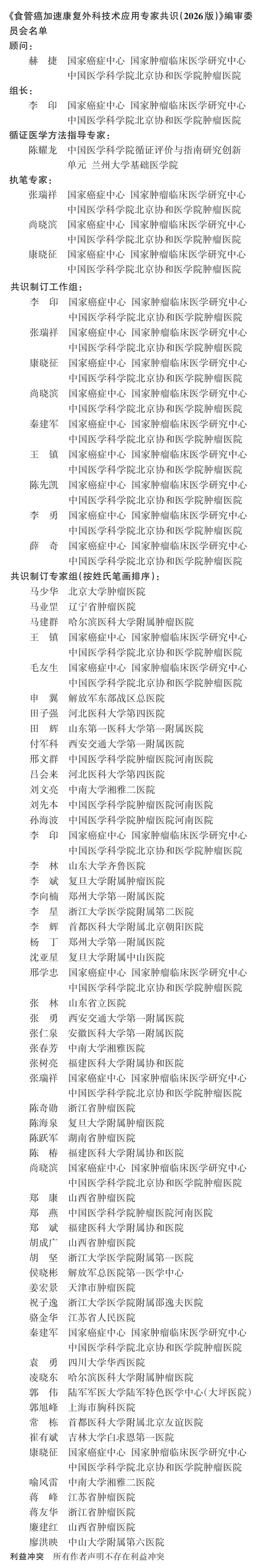 为进一步规范临床实践,由国家癌症中心、中国医师协会胸外科医师分会、中华医学会胸心血管外科学分会等权威学术机构共同发起,组建了涵盖胸外科、麻醉科、重症医学科、临床营养、循证医学及护理学等多学科专家的工作组,系统检索与评估了近10年来的最新循证证据,最终制定了《食管癌加速康复外科技术应用专家共识(2026版)》。共识覆盖术前、术中、术后及随访全周期的ERAS路径,并针对关键环节形成了4大类、32项具体推荐意见,具体内容如下。
