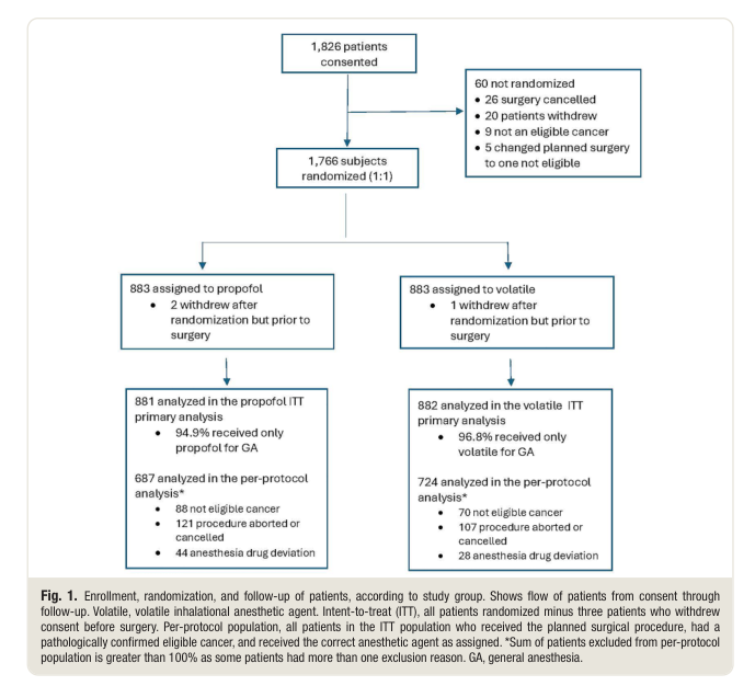 在此背景下,研究团队于2017年在美国发起了GA-CARES试验,旨在验证假设:与吸入麻醉相比,丙泊酚能改善恶性癌症患者的总生存率和无病生存率。