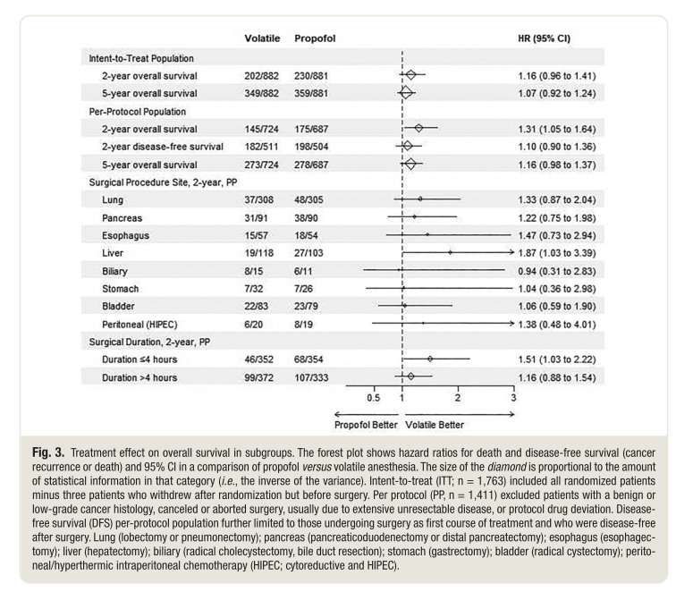 1.不必为“抗肿瘤作用”而刻意选择丙泊酚,两种麻醉方式在癌症预后方面并无差异。