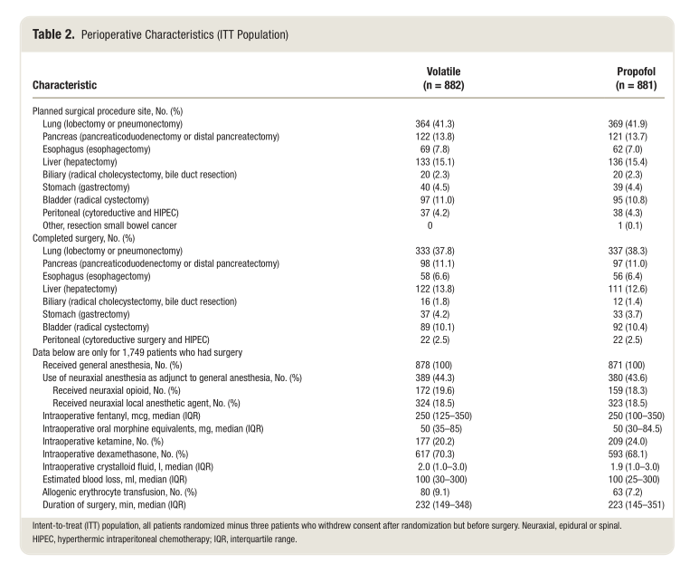 意向性治疗分析显示,丙泊酚组2年死亡率26.1%(230/881),挥发性(吸入)麻醉组22.9%(202/882),两组无显著差异(HR=1.16,95%CI:0.96~1.41,P=0.115)。
